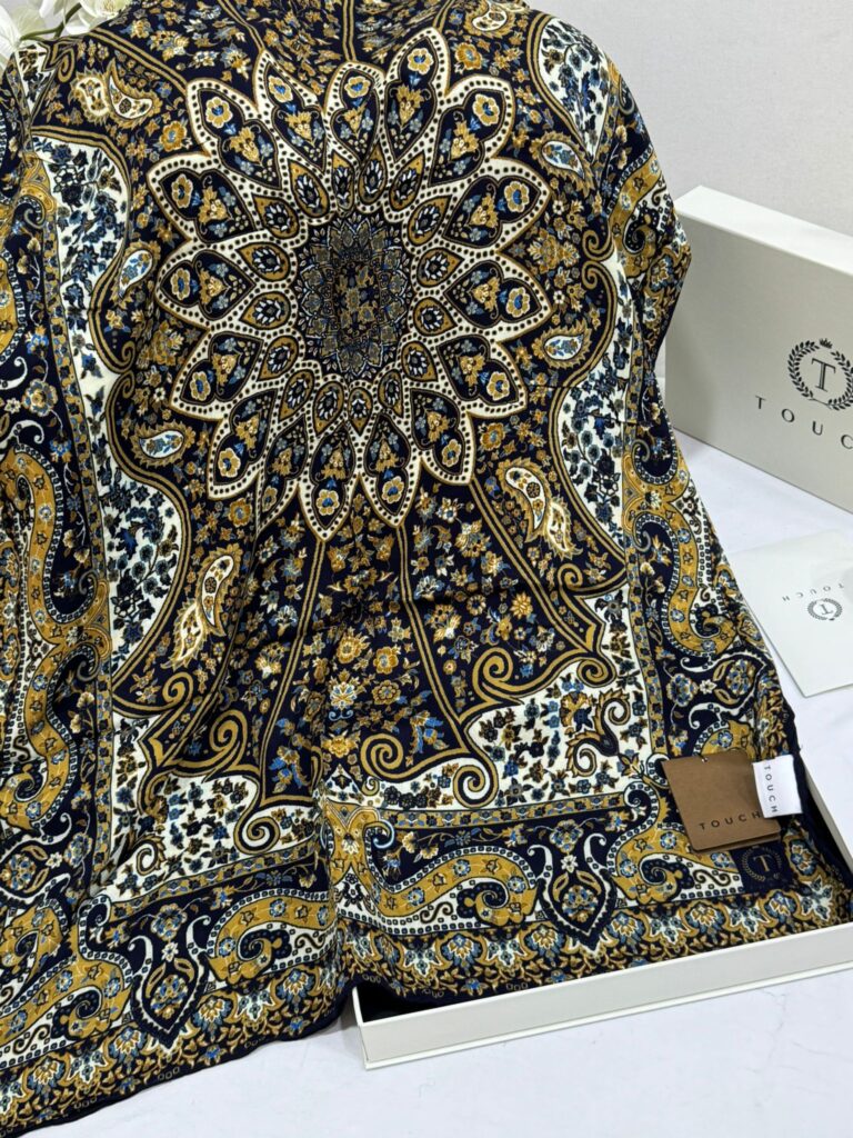 Touch İthal Etnik Desen Yün İpek Şal- 20450 – Lacivert Gold