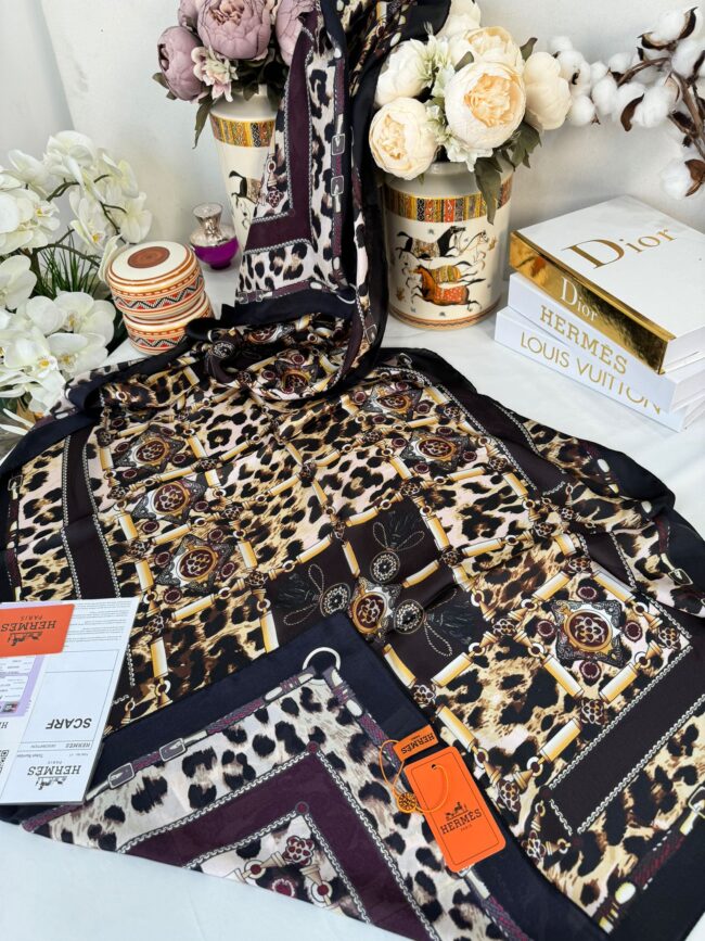 Hermes Leopar Çift Taradlı Vual İpek Şal 11143 – mocha