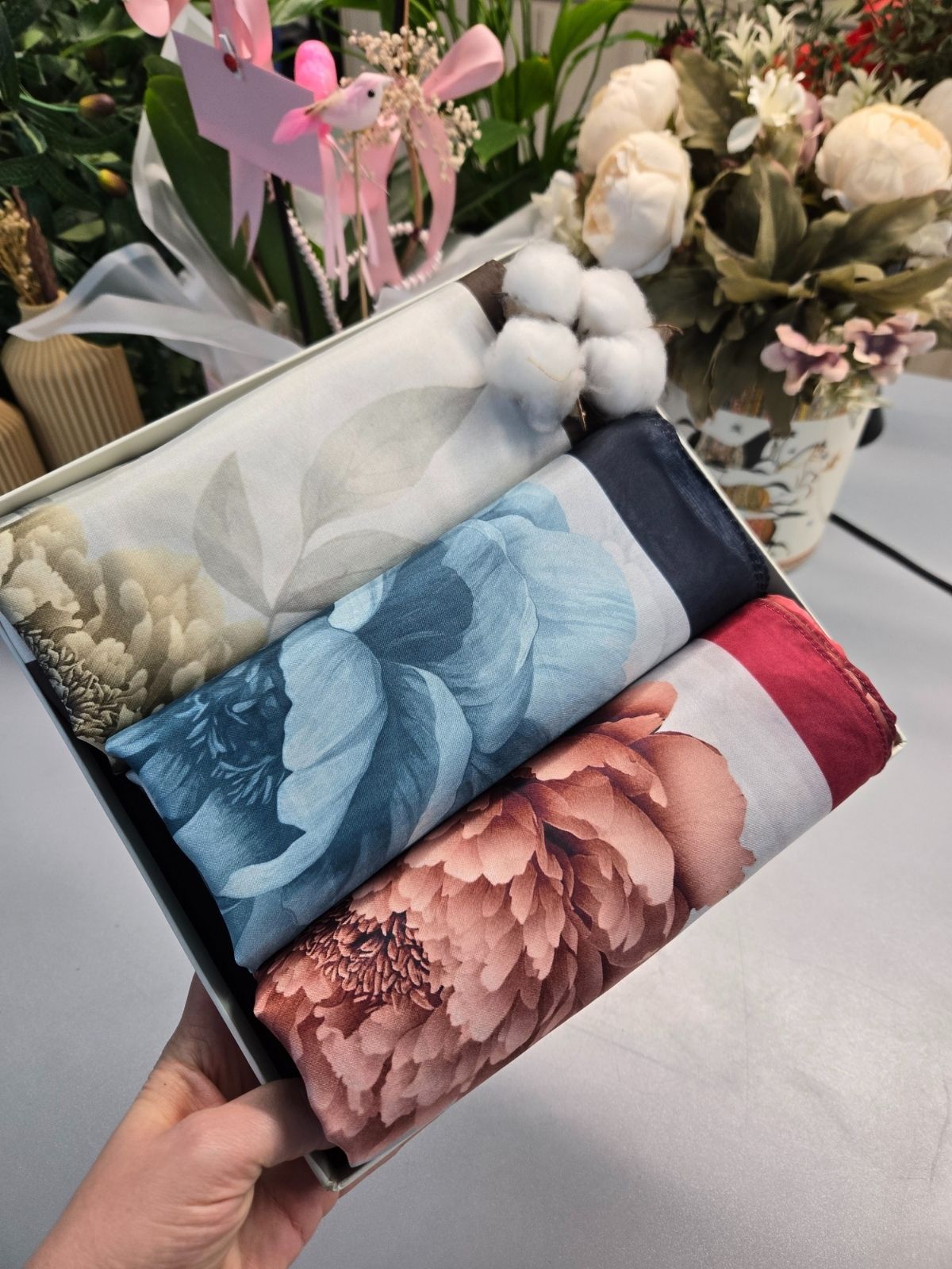 Minimal tasarımlı doğal tonlu kutusu sayesinde zarif bir sunum sağlar; hediye etmeye hazırdır. Yumuşak dokulu şallar, rahat kullanım ve estetik görünümü bir arada sunar.