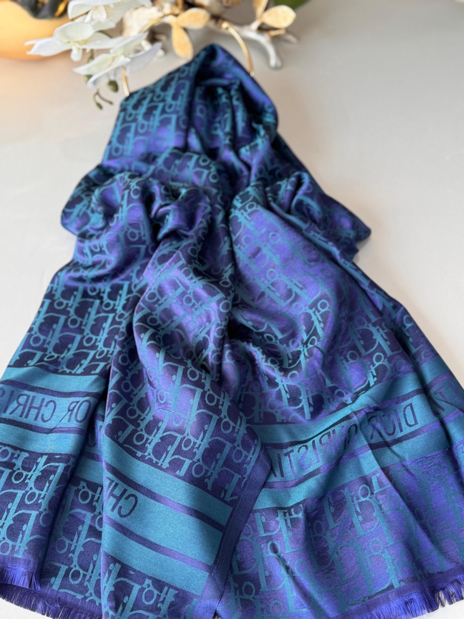Dior DESEN Çift taraflı İpeksi Jakar Şal – Lacivert