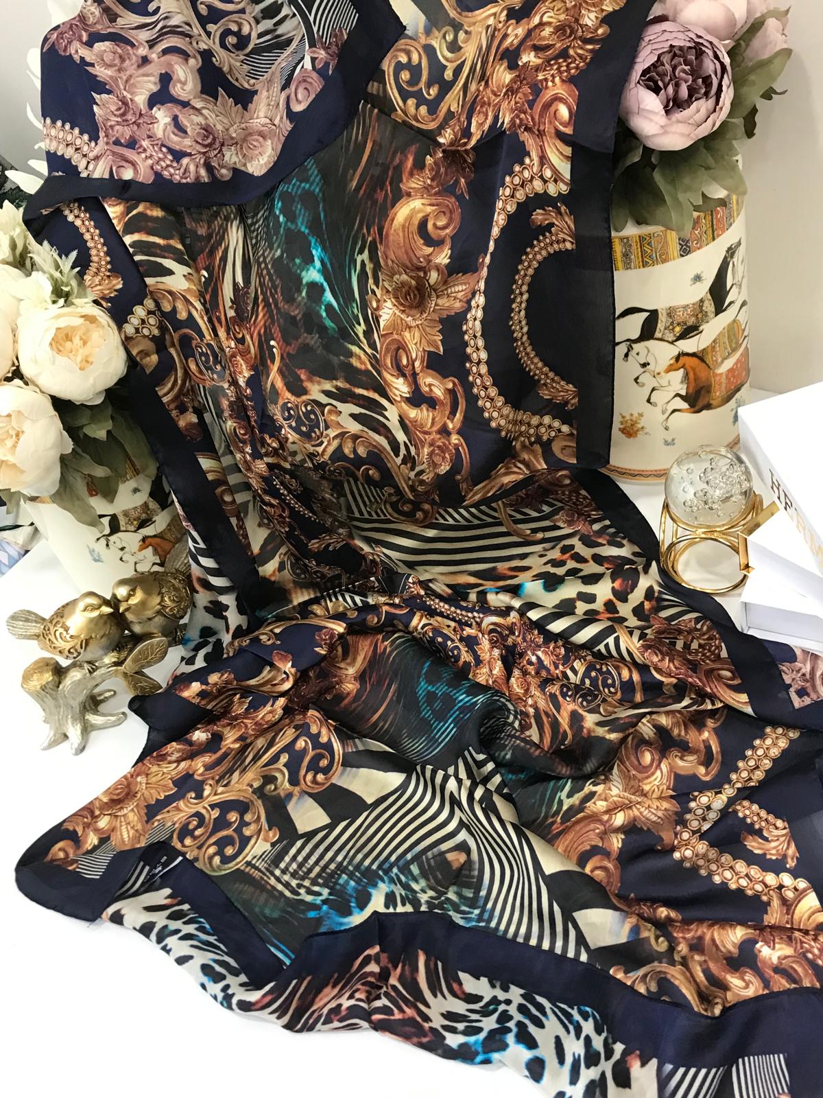 Etnik Leopar Desenli İthal Vual ipek Şal 14253-Lacivert