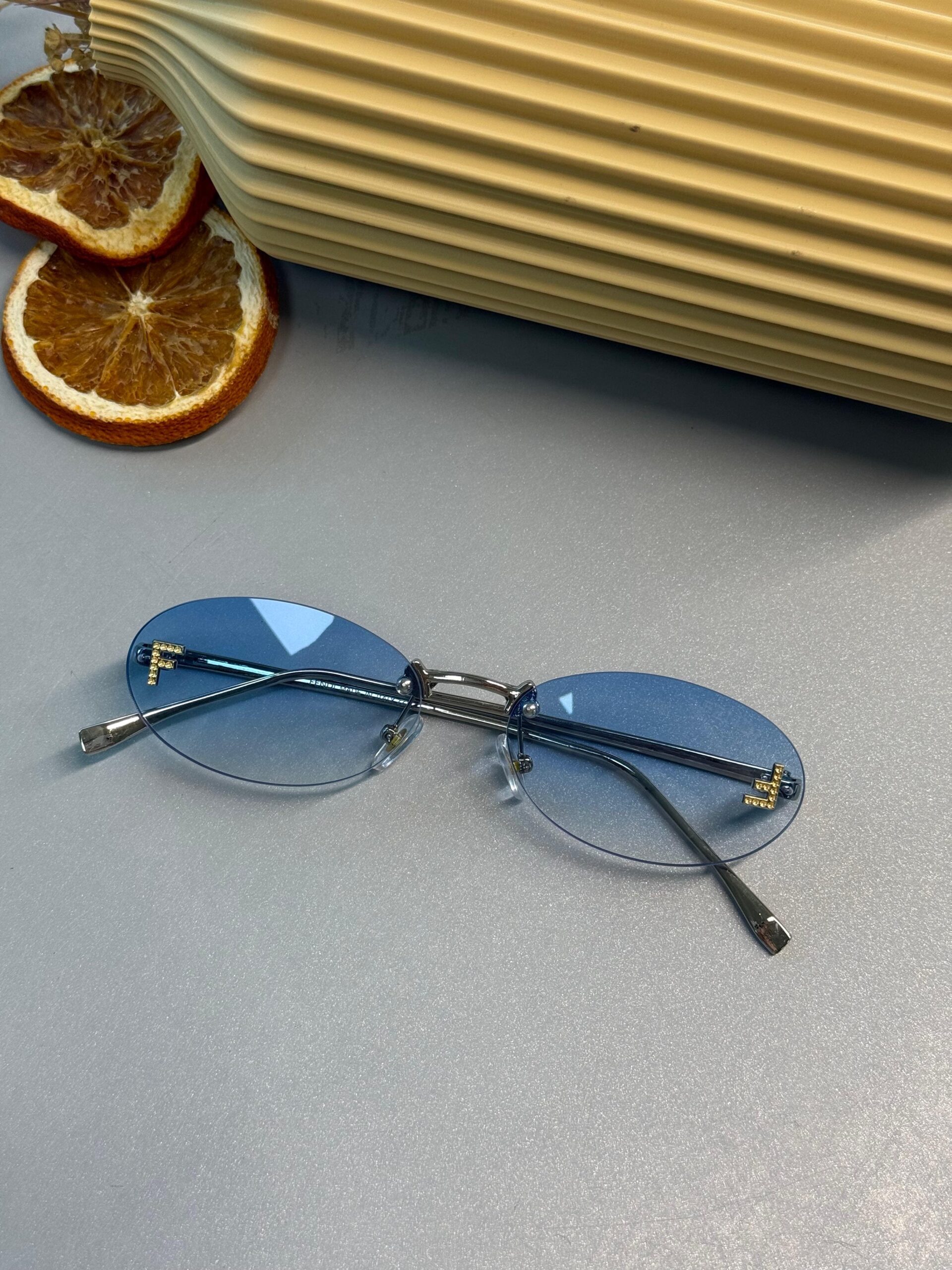 Mavi gradyan lensleri, göz alıcı kristal “F” logosuyla zarifçe taçlandırılan bu rimless model; minimal tasarımı lüks ayrıntılarla buluşturarak modern şehir ruhunu yansıtıyor. Altın tonlu paslanmaz çelik köprü, çerçevesiz oval siluete hafiflik ve incelik katarken, koyu kestane asetat saplar ergonomik kavisleri sayesinde gün boyu konfor sunar.