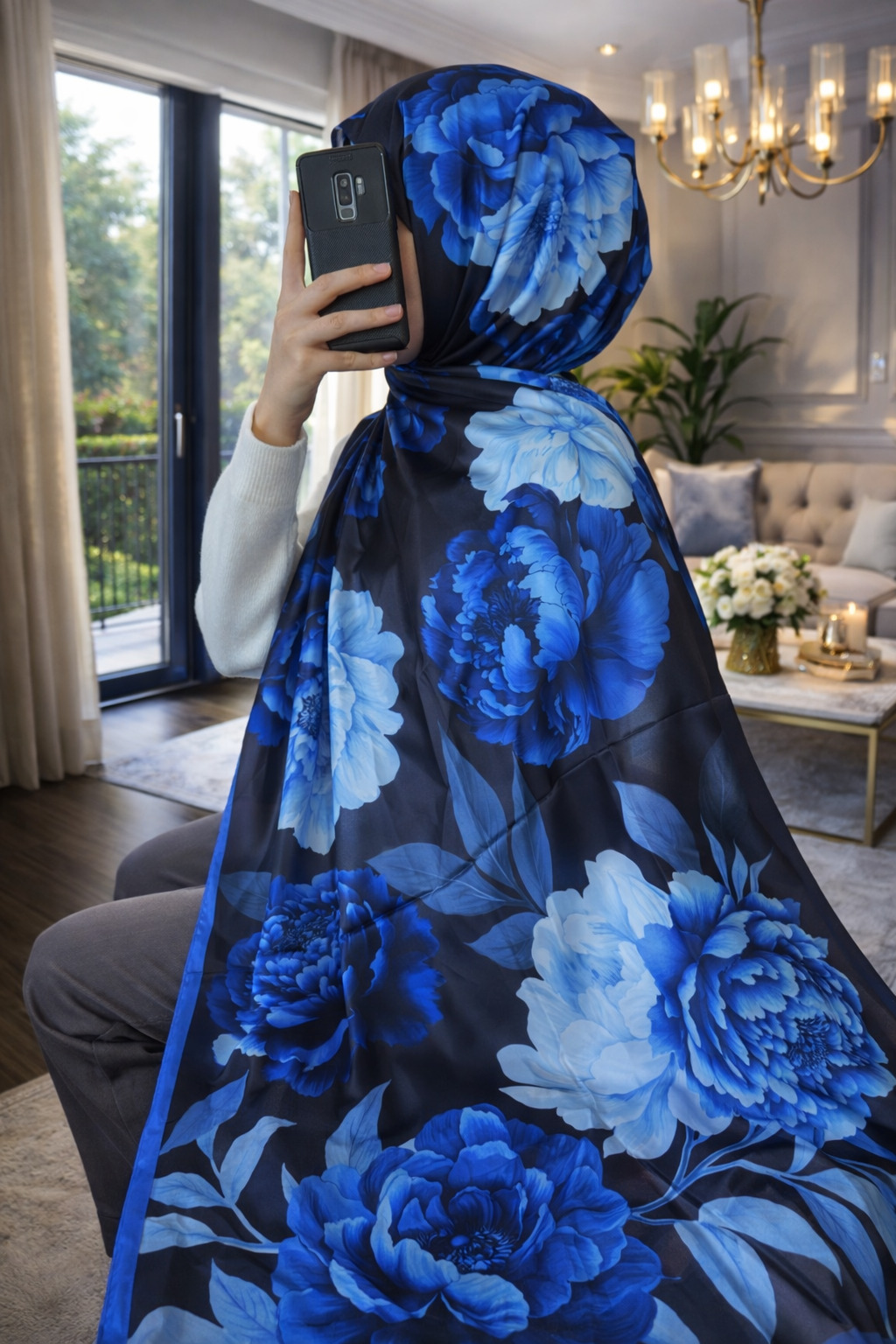 Flora Vual İpek Şal 10100 -Gece Mavi