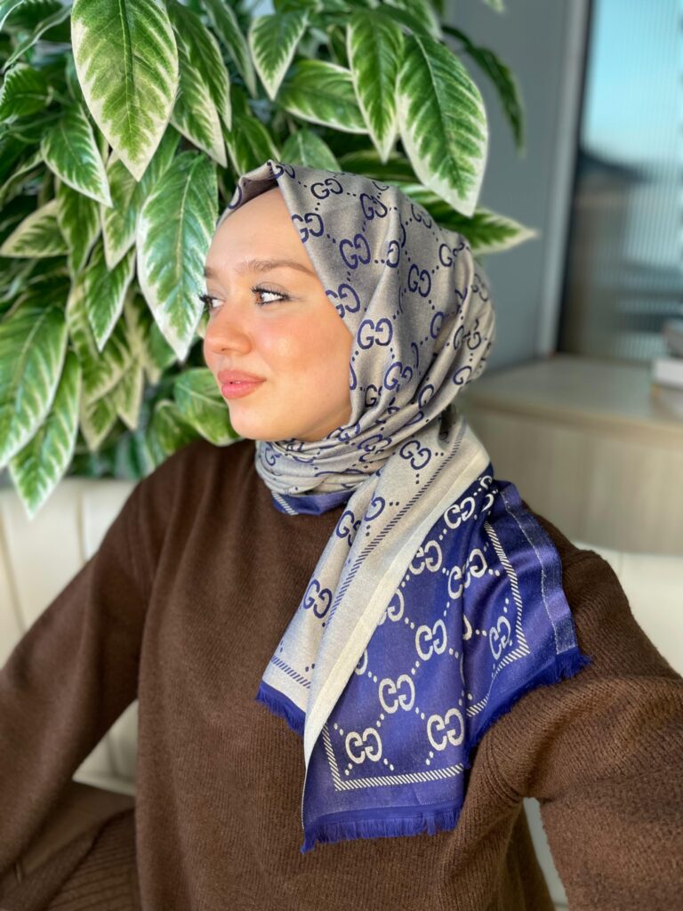 G Desenli İpek Kaşmir Çift Taraflı Şal 440344 – Vizon/ Lacivert