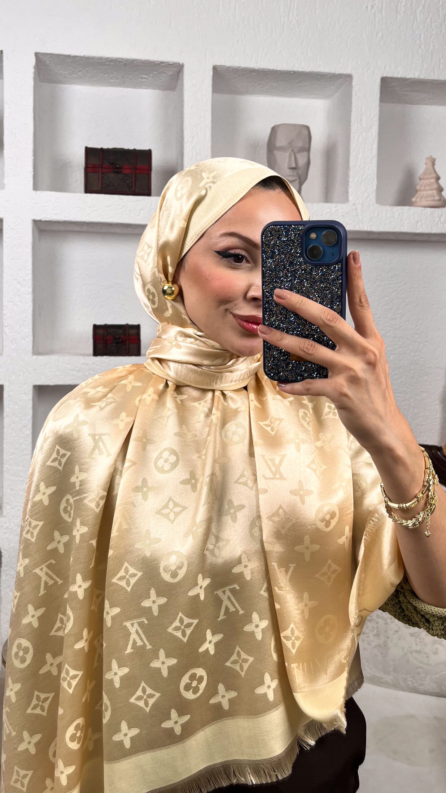 Lv Desenli İpek Kaşmir Çift Taraflı Şal – Bej