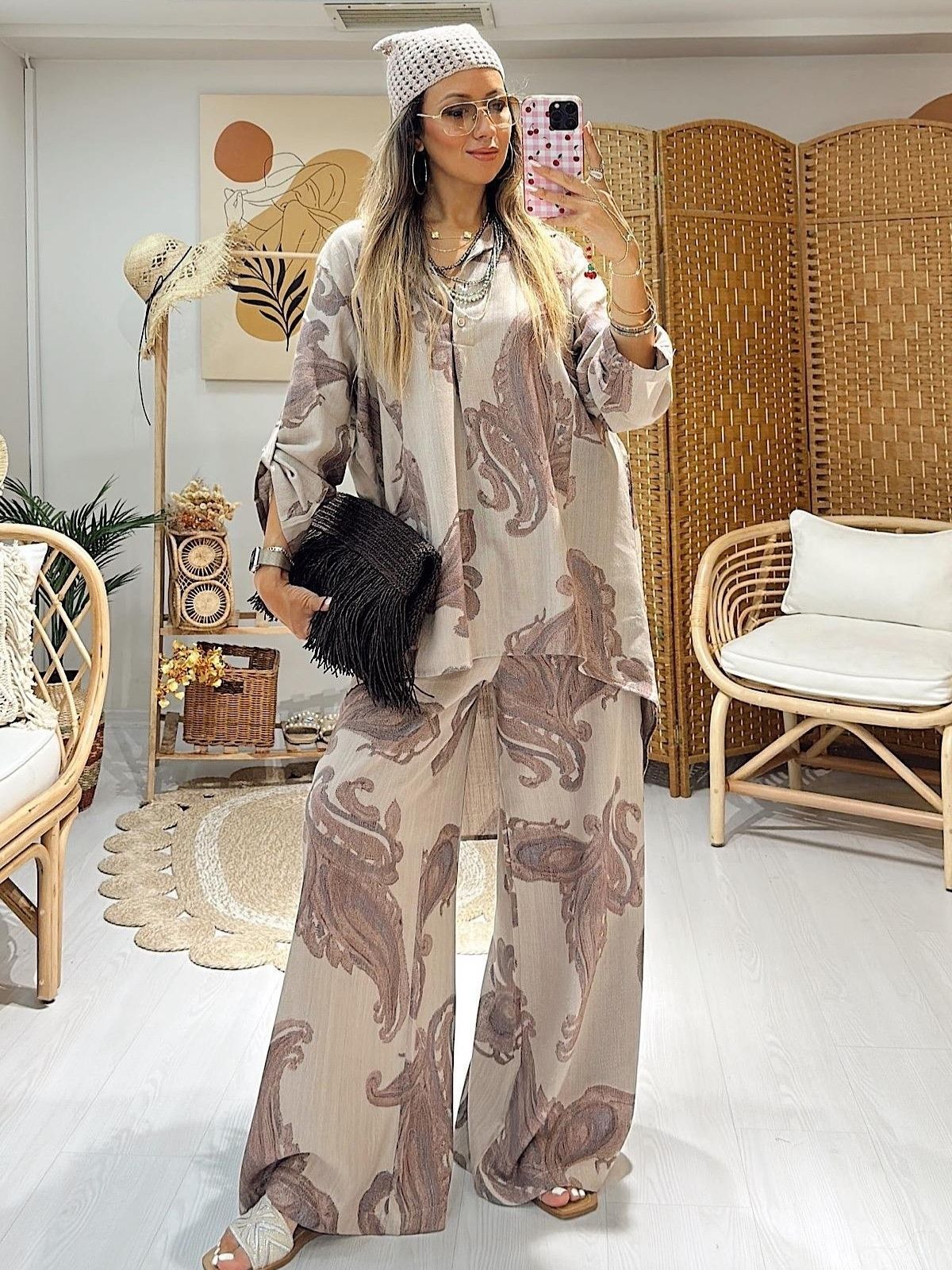 Keten Şal Desen Bol Paça İkili Takım TK100222 – Bej