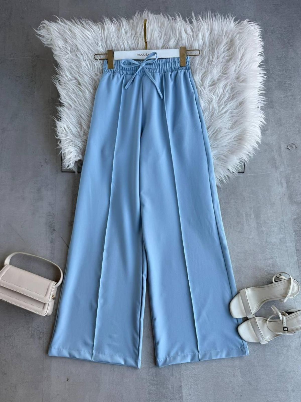 Modern ve zarif bir stile sahip bu yüksek bel, geniş paçalı pantolon; rahatlığı ve şıklığı bir arada sunar. Hem günlük kombinlerde hem de ofis şıklığında kolayca tercih edilebilir. Dikiş detaylarıyla kusursuz bir duruş sağlayan pantolon, hafif kumaşı sayesinde gün boyu konfor sunar. Topuklu ayakkabılar veya düz sandaletlerle rahatça kombinlenebilir.