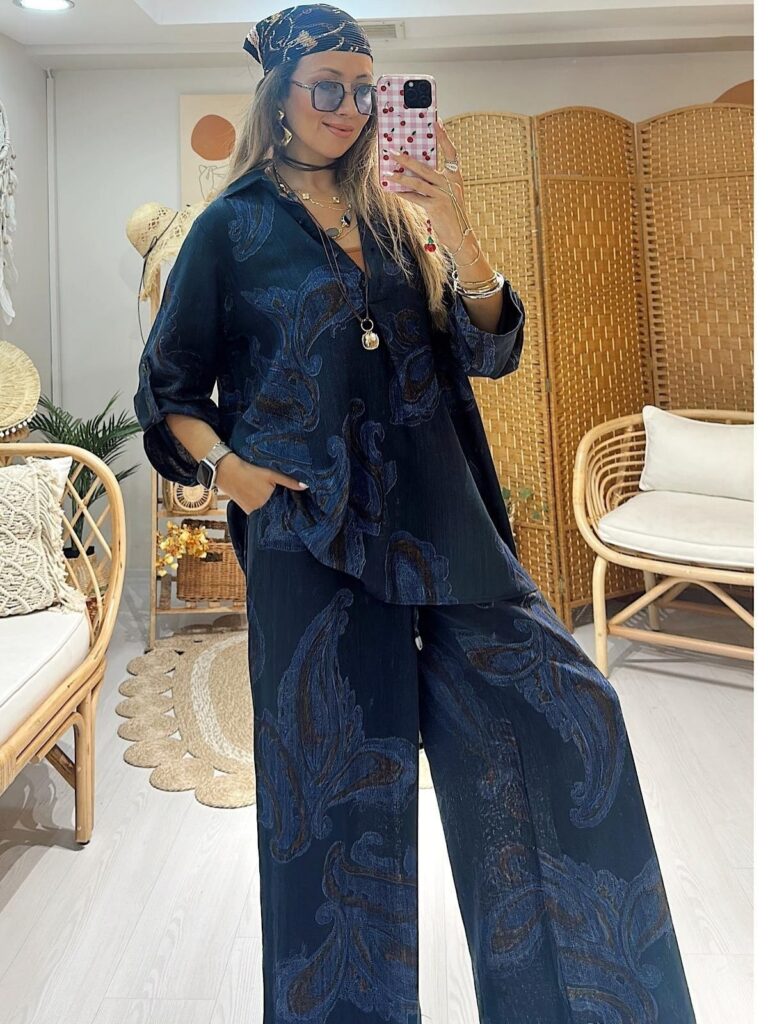 Keten Şal Desen Bol Paça İkili Takım TK100222 – Lacivert