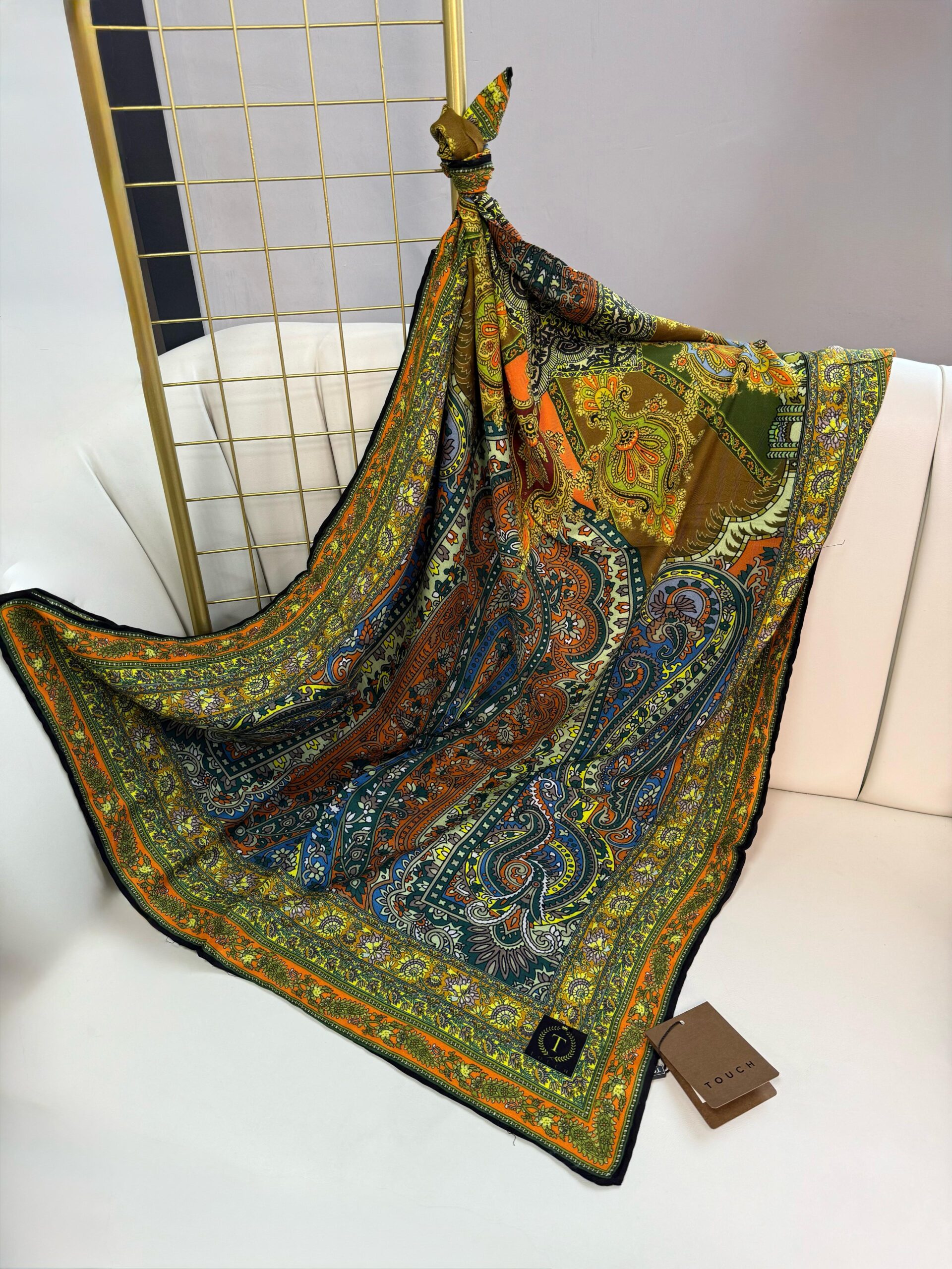 Touch İthal Etnik Desen Yün İpek Şal 35110 –Portakal-Zümrüt