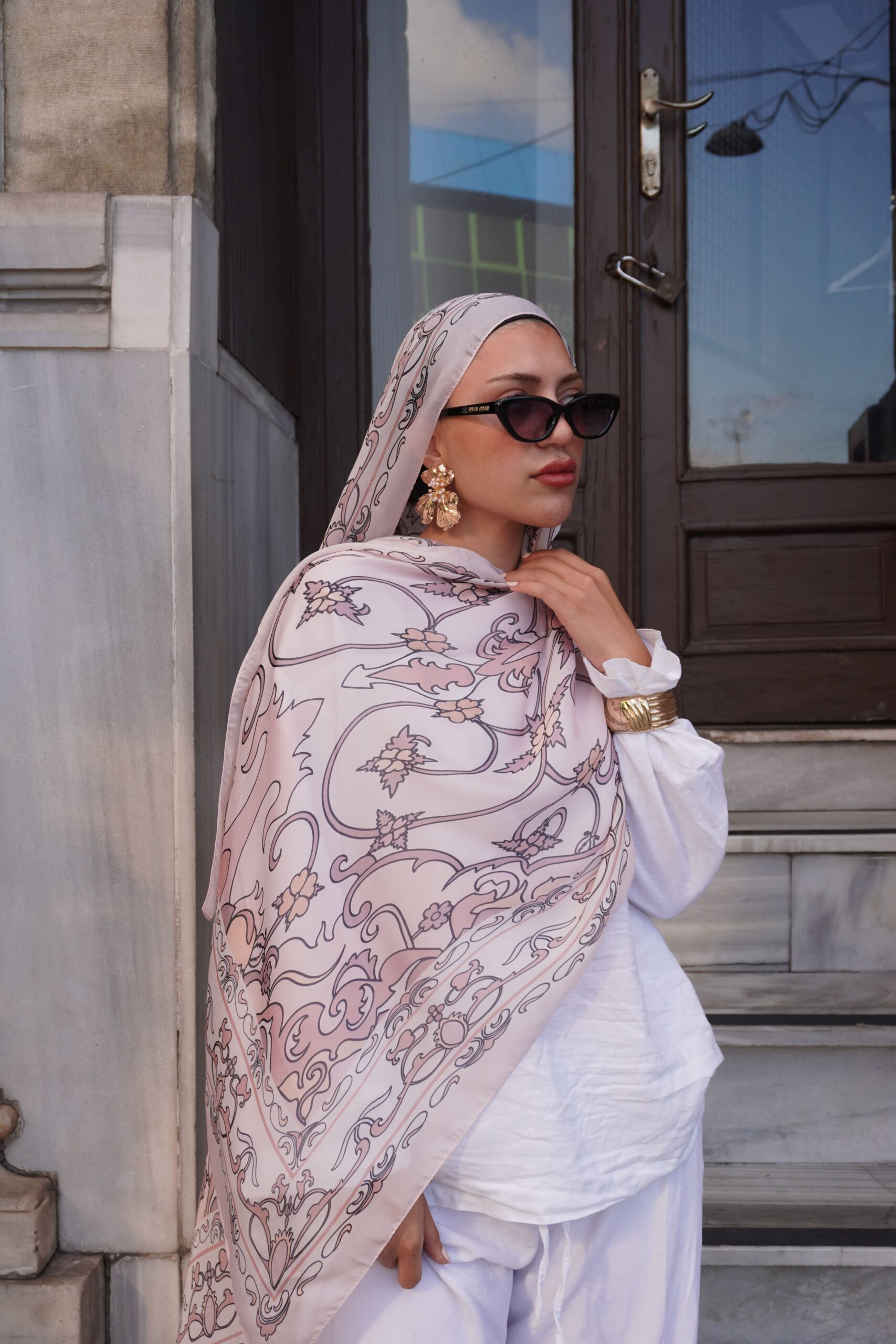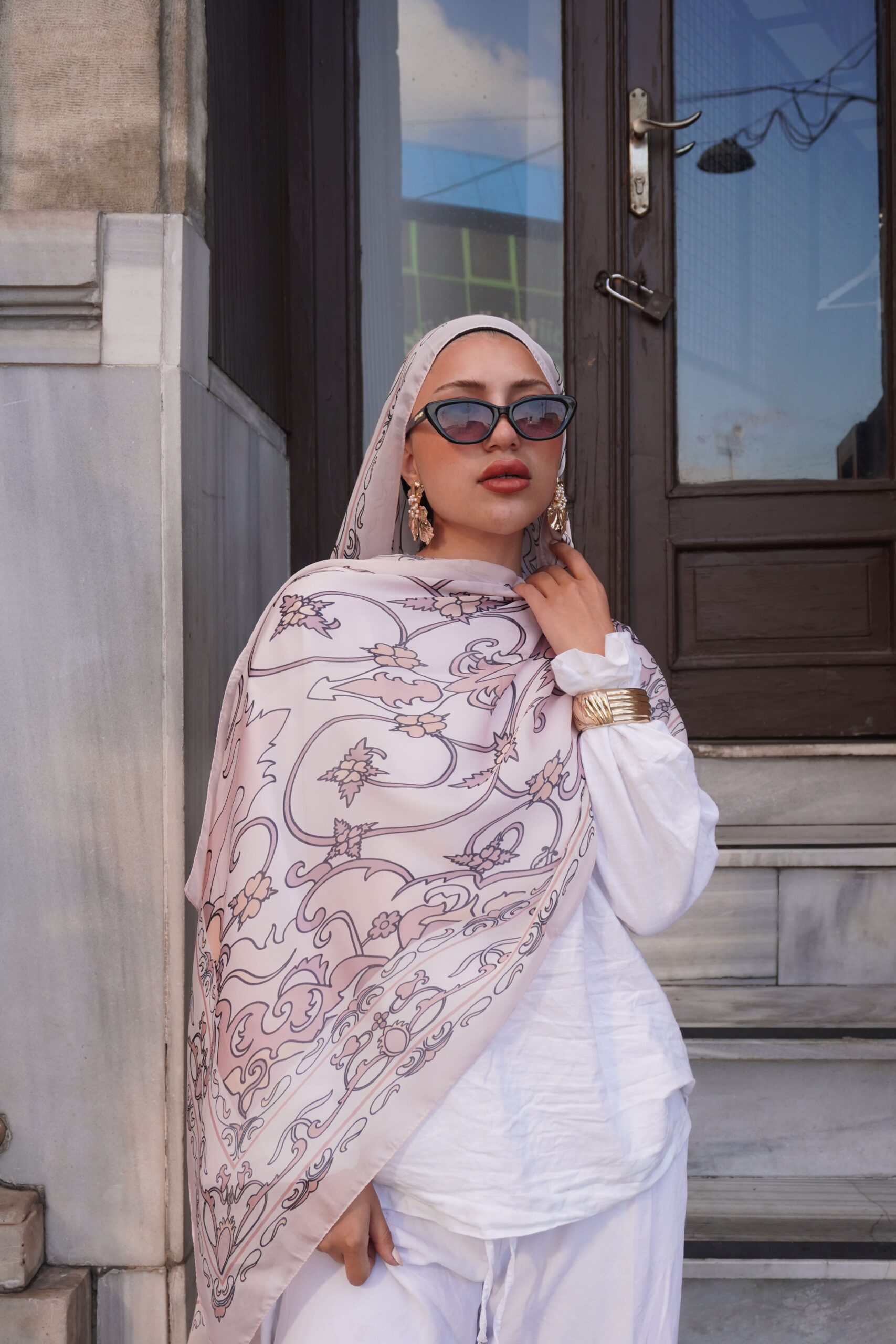 Mystic Bloom Desen Pamuk İpek Şal-Sütlü kahve